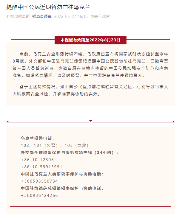 提醒!中国公民近期暂勿前往乌克兰 据“领事直通车”微信公众号5月27日消息,当前,乌克兰安全形势持续严峻,乌政府已宣布将国家战时状态延长至今年8月底。外交部和中国驻乌克兰使领馆提醒中国公民暂勿前往乌克兰,已撤离至第三国人员暂勿返乌,少数自愿在乌境内停留的中国公民加强安全防范和应急准备。如遇紧急情况,请及时报警,并与中国驻乌克兰使领馆联系。