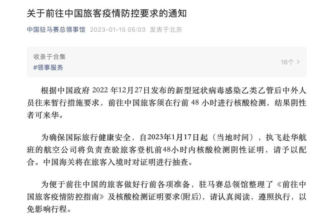 中国驻马赛总领事馆:关于前往中国旅客疫情防控要求的通知 【新闻早知道】